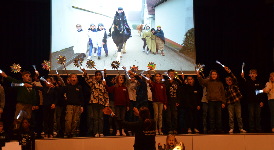 Im November fand wieder als fester Bestandteil des Schullebens der traditionelle Martinsumzug an der Härtsfeldschule statt. Vor dem großen Tag haben die Viertklässler fleißig geprobt, gebacken und Gegenstände für Spenden gesammelt. In der Härtsfeldhalle wurde dann die Geschichte des Heiligen Martin durch verschiedene Texteinlagen vorgespielt, die von unterschiedlichen Instrumenten untermalt wurden. Die gemeinsam gesungenen Lieder, wie zum Beispiel „Lichterkinder“, sorgten für eine besondere Stimmung in der Dunkelheit.