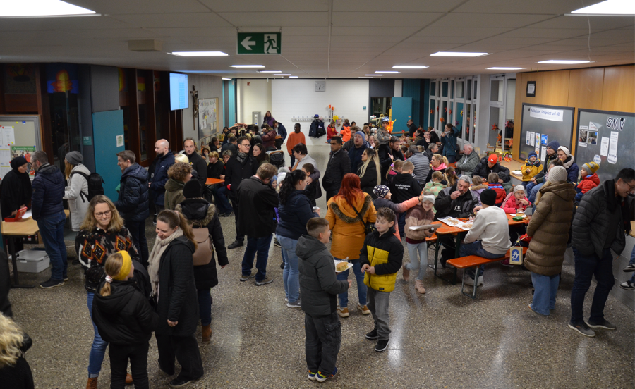 Nach dem Umzug ließen alle den Abend in der Aula gemütlich bei Punsch und Würstchen ausklingen. Hier wurden verschiedene Stände aufgebaut, in denen gebackene Martinsgänse, gespendete Bücher oder Spiele verkauft wurden, die die Grundschüler vorher fleißig gesammelt hatten. Der Erlös geht sozialen Einrichtungen zu. So wird die Botschaft des heiligen Martin, anderen in der Not zu helfen und untereinander zu teilen, auch heute noch an der Härtsfeldschule gelebt.