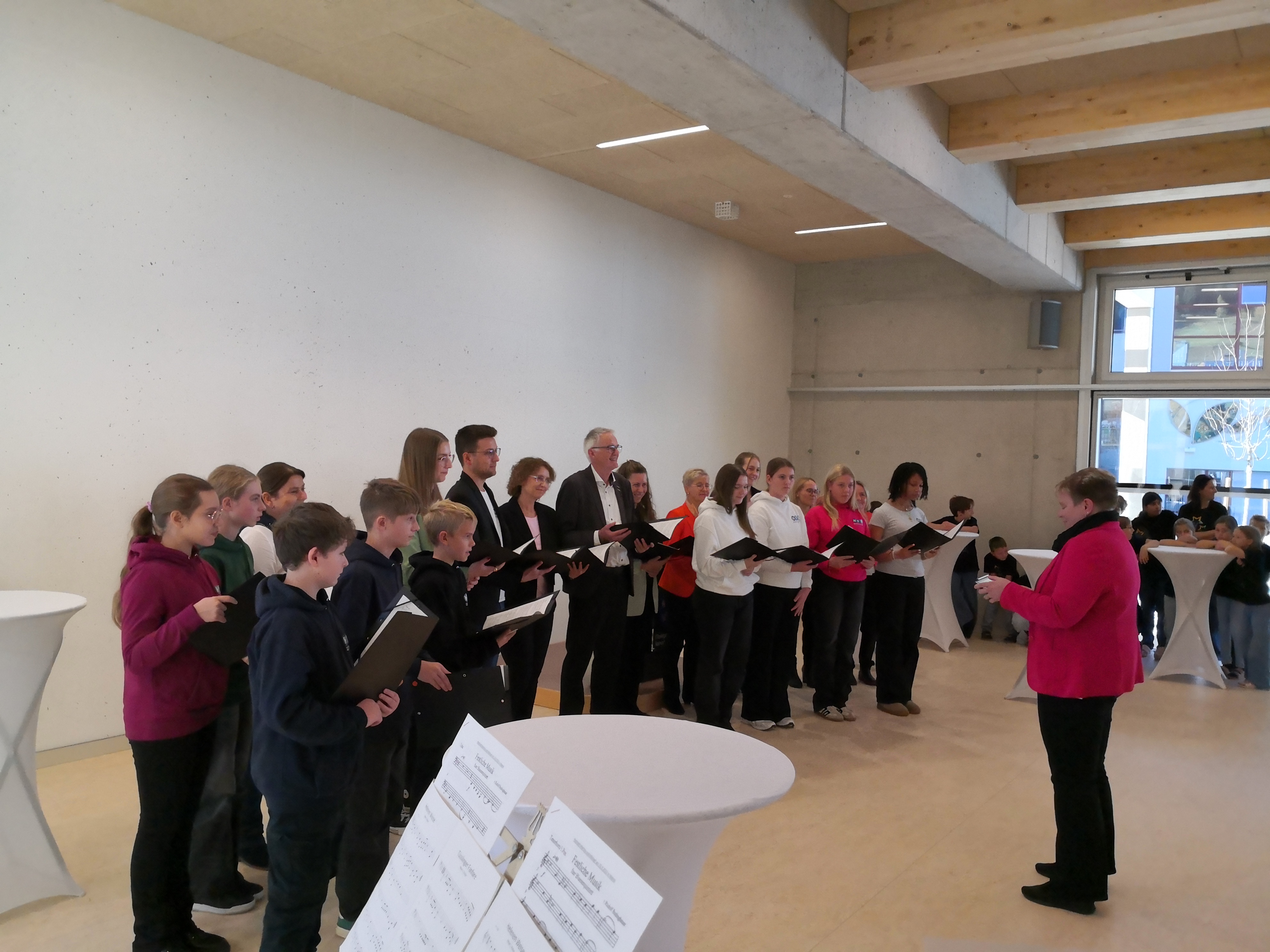 Ein tolles Erlebnis hatte vergangene Woche der HFS-Schüler-Lehrer-Chor, der mit einer Neresheimer Delegation nach Steinach zur Eröffnung des Neubaus der Volksschule reiste. Nach dem herzlichen Empfang probten die 20 Sängerinnen und Sänger zunächst mit dem Steinacher Chor, bevor die eindrucksvolle Eröffnungszeremonie begann. Vor dem Tiroler Landeshauptmann Anton Mattle, dem österreichischen Bildungsminister Christoph Wiederkehr, Steinachs Bürgermeister Florian Riedl, unserem Bürgermeister Thomas Häfele und zahlreichen Gästen sangen die Härtsfeldschüler in beeindruckender Manier gemeinsam mit den Steinacher Chor zu Beginn „Fest der Freude“, also die Eurovisionshymne von Antoine Charpentier. Den Abschluss der Feierlichkeiten schmückte der HFS-Chor unter der Leitung von Carmen Weber mit einem Soloauftritt und verzauberte mit „Only you“ von den Flying Pickets die große Festgästeschar.