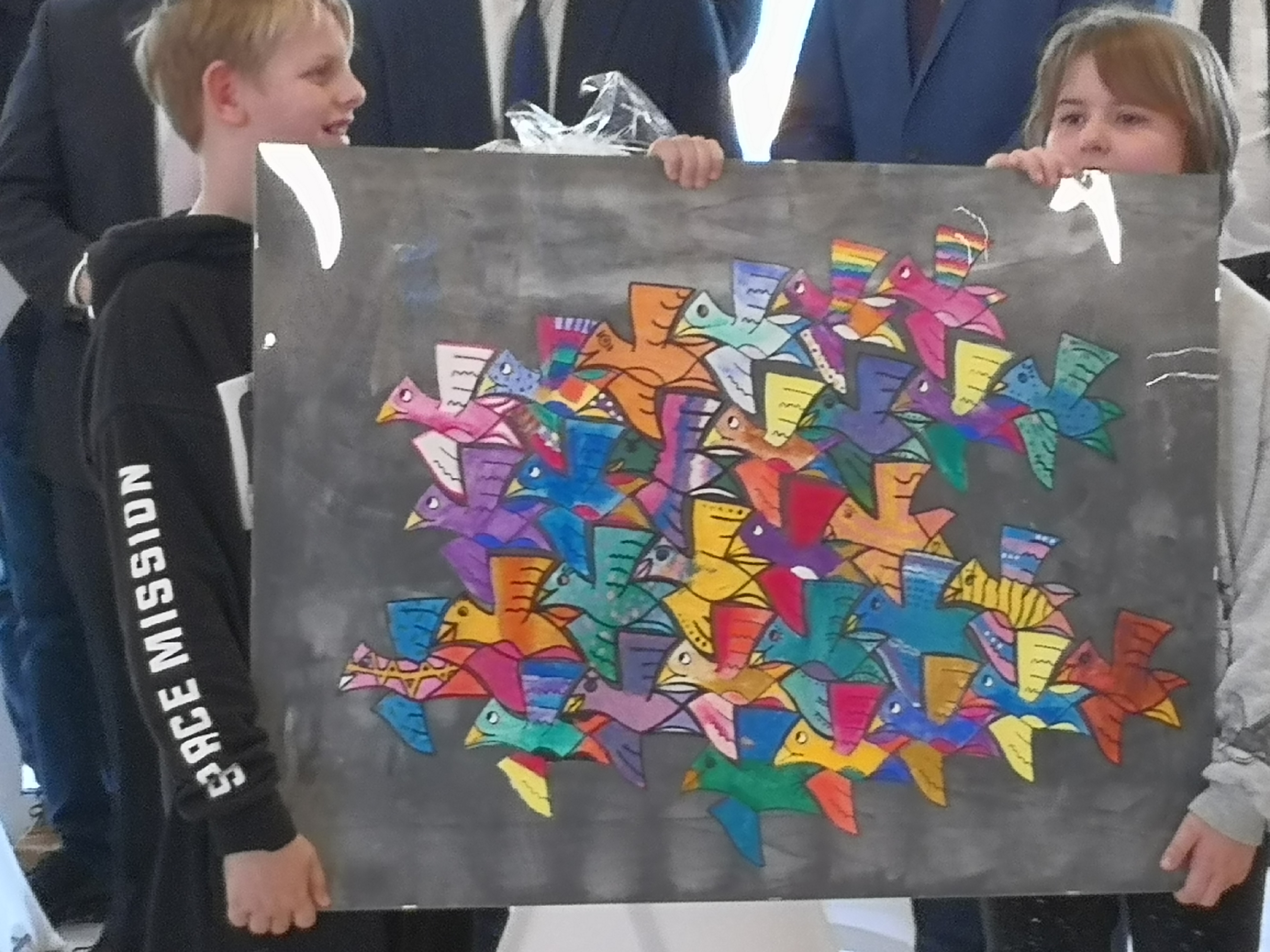 Eine weitere Verbindung wurde auf künstlerischem Wege geschaffen. Härtsfeldschüler der R 5C unter Leitung von Judith Schmid und Steinacher Kinder gestalten zwei Vogelbilder, die zusammengesetzt wurden und als Zeichen der Freundschaft im neuen Schulhaus ihren Platz finden werden.